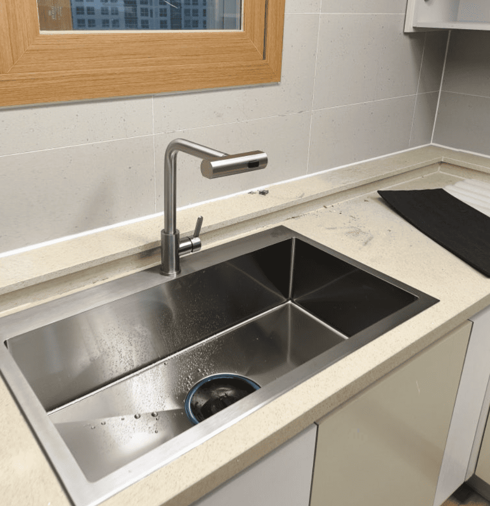 - 공간 활용: 기존 싱크볼보다 넓고 깊은 사각싱크볼은 더 많은 물건을 수납할 수 있어 주방이 깔끔하고 효율적으로 변했습니다.